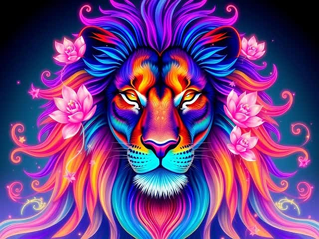 1. Color Palette: The lion features a vivid array of colors, including electric blues, purples, oranges, and pinks. This striking combination creates a surreal and imaginative appearance.
